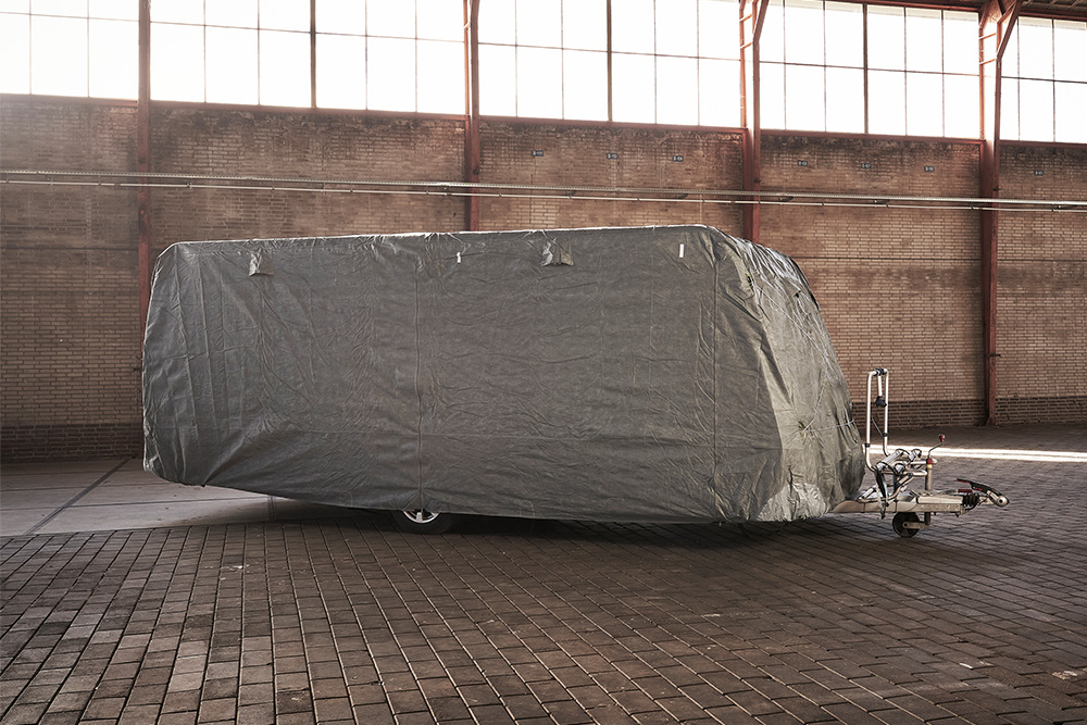 1. Rol de hoes volledig uit voor de caravan met de ritsen omhoog.