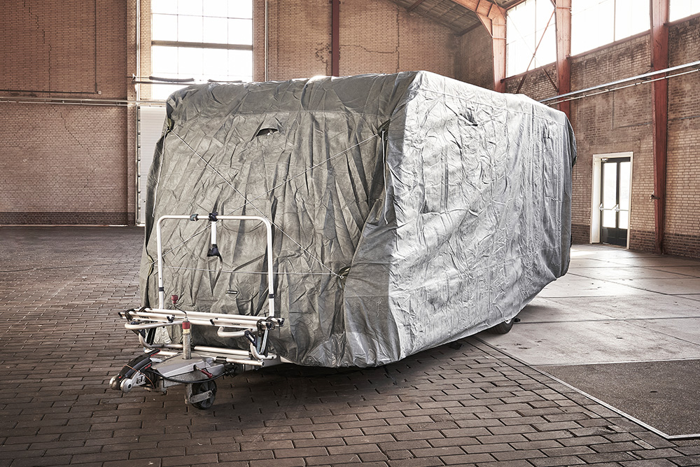 3. Trek de hoes volledig over de caravan (handigst m.b.v. een keukentrap).
